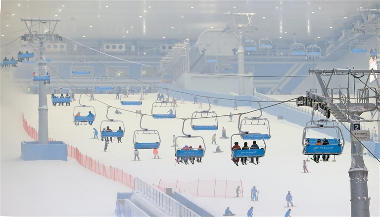 记者现场见到,入口处旁边的义工服务点,身穿红马甲的义工们忙得不可开交。“取票往左,入园往右!”一位义工一边指引方向,一边快速回答着游客的咨询。而与雪场一墙之隔的商业区同样人气十足,不少市民在商场闲逛,或在咖啡馆小憩。商场中庭的表演吸引了不少带孩子的家庭,欢笑声此起彼伏。