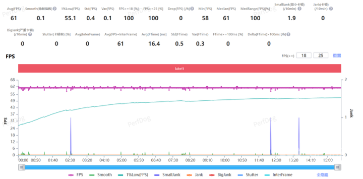 《原神》选择极高画质+60FPS,在须弥城跑图进行测试,经过PerfDog实测,平均帧率可以达到61FPS,帧率表现非常稳定。
