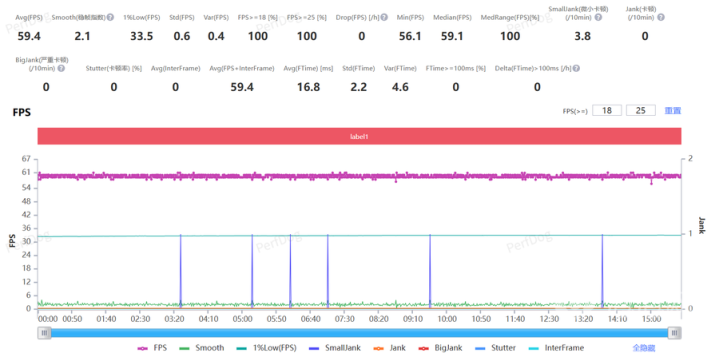 《崩坏:星穹铁道》选择最高画质+60FPS,在星槎海跑图测试,经过PerDog实测,平均帧率为59.4FPS,帧率表现同样的出色。